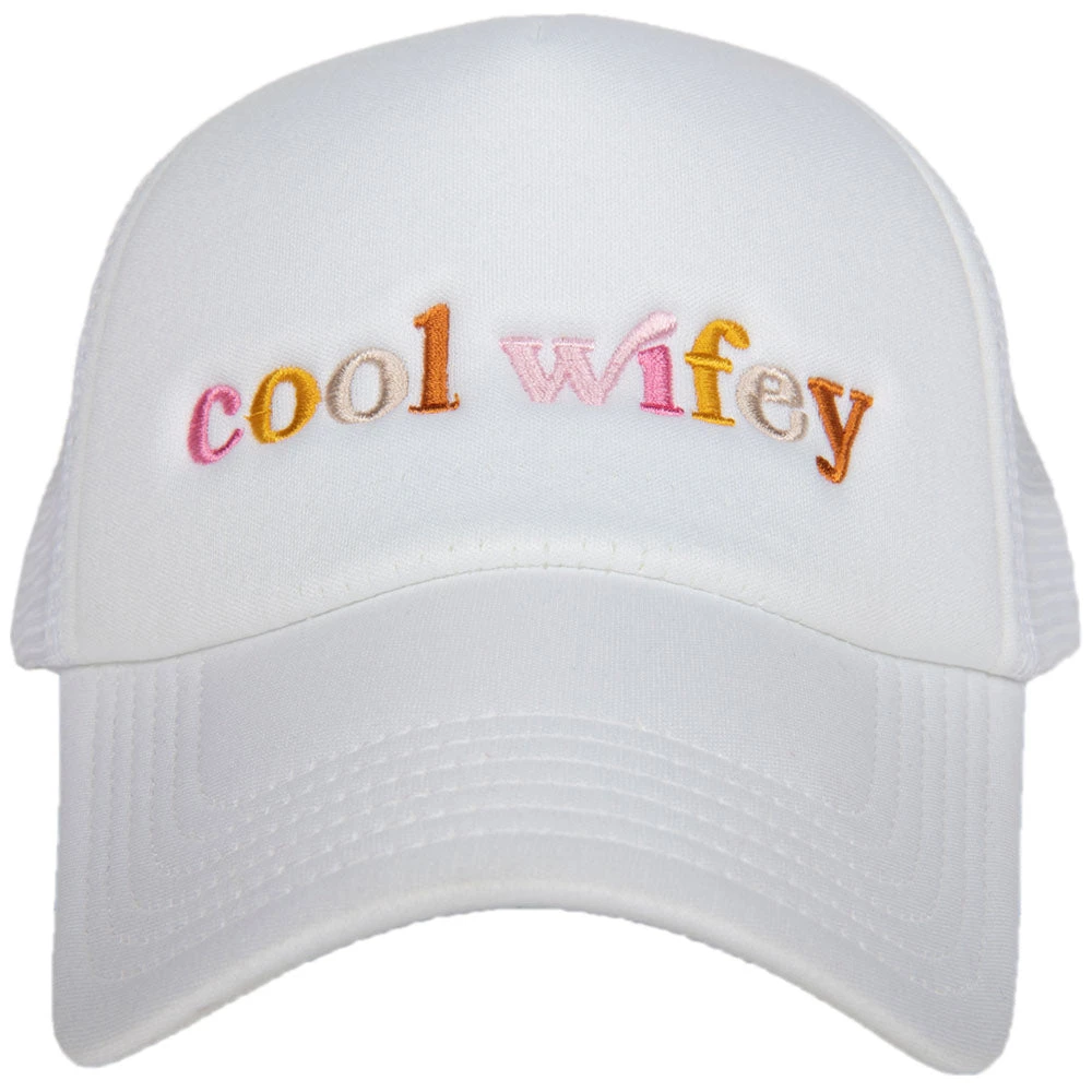 A cool wife = a happy life. The cool wifey mesh trucker hat for women who meet the criteria, this all white foam trucker hat flaunts colorful embroidery that tells it like it is.