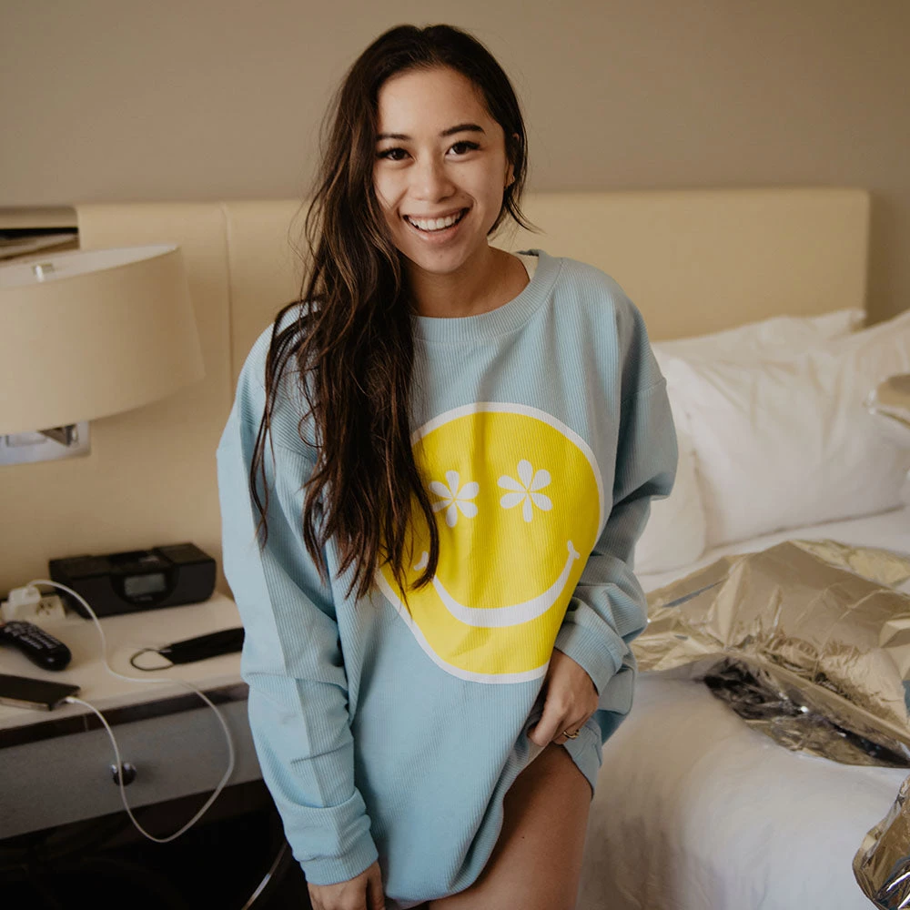 You’ll be smitten with the all happy design applied to this cute corded crew sweatshirt featuring flower eyes and a smile, the happy face graphic is totally groovy.