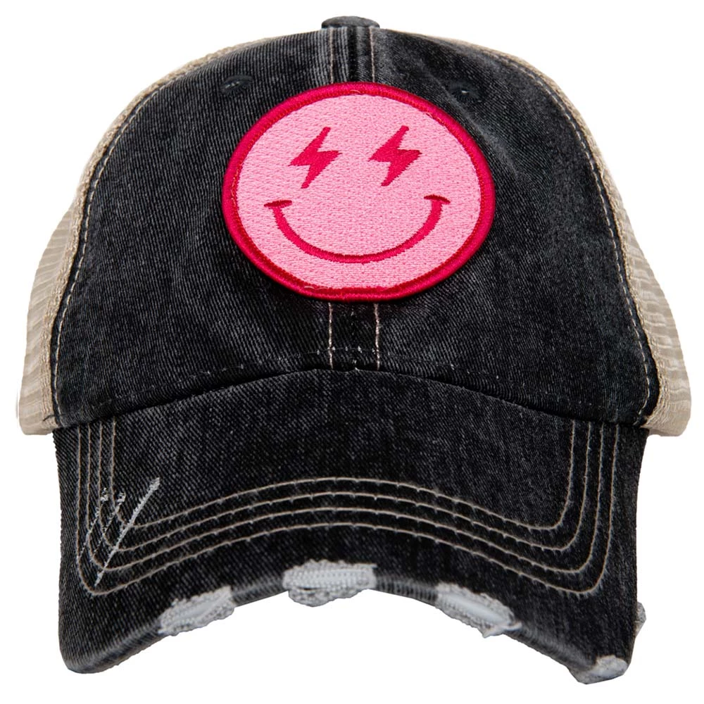 The hot pink happy face patch emblem applied to this cute trucker hat for women features a happy face emoji donning a pair of lightning bolt eyes.
