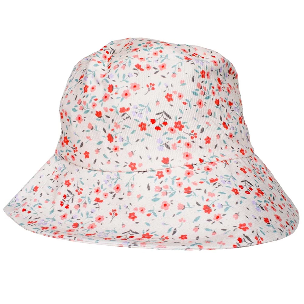 This cute floral bucket hat for women and girls features a dainty allover flower print in summery shades of rosy pink, cherry red, lilac and peach.