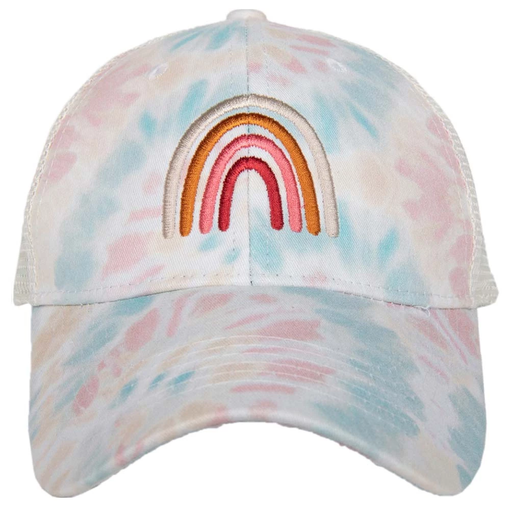 From our collection of tie dye trucker hats for women, this cute mesh back rainbow hat features an embroidered rainbow symbol and a mix of pretty pastel colors.