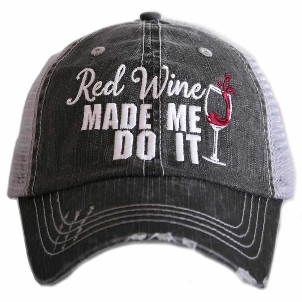 Our “Red Wine Made Me Do It” trucker hat is beautifully designed with white embroidered letters, a wine glass, and red stitching splashing from the glass. The distressed detail of the cap offers a worn look that goes well with weekend clothing.